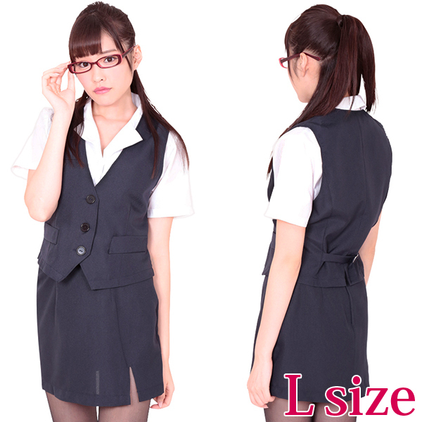 落ち着いた紺色が清楚な秘書の雰囲気を演出!セクシーな胸元の半袖ブラウスとミニスカートに、3つボタンベストのなりきりコスプレ3点セットで、魅力的なOLに変身しちゃおう!
