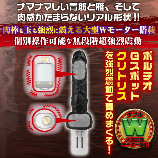 ●スキンカラーの猛々しいフォルム●スジ・シワ・ハリなど本物そっくり●裏スジの先端と玉袋にモーター内蔵●個別に調節できるスライドスイッチ●生々しさを煽るソフト樹脂素材製。