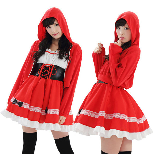 あの有名なおとぎ話の主人公になりきっちゃお!真っ赤な衣装がインパクト抜群な赤ずきん風コスチューム。
