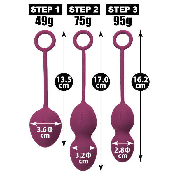 ●シックで妖艶なバイオレットカラー●形状&重さの異なるノバボール3種入●滑らかでマットな質感のシリコン製●それぞれ内部にメタルボールを内蔵●まずは49gからスタート→75g→95gと徐々にサイズ&レベルアップ●それぞれ1日30分程度を30日間継続●挿入したままスポーツなども可能●100%完全防水で丸洗いOK。