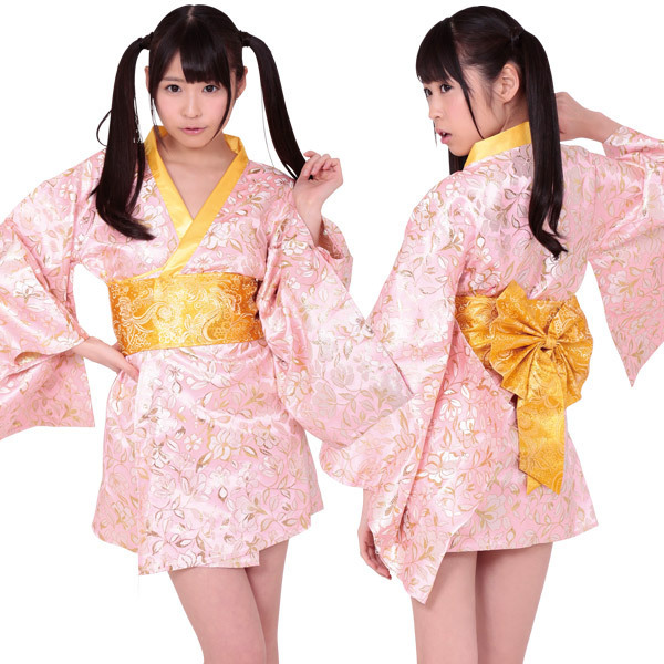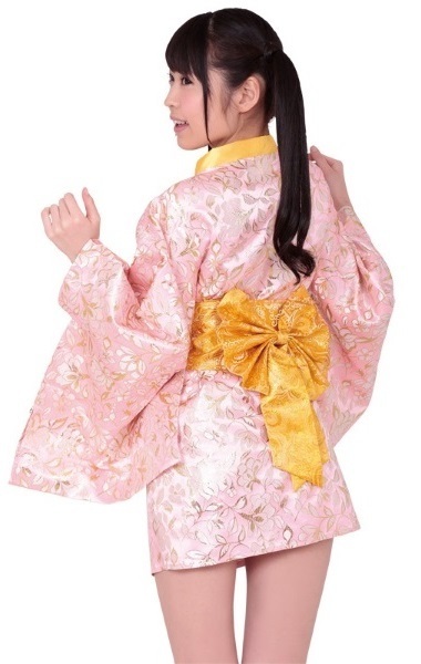艶やかなサテン生地で仕上げた淡いピンクのミニ着物ワンピース。