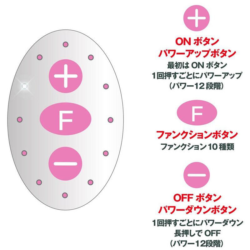 ●スタンダードなエッグ型タイプ●握りやすいスティックリモコン●12種強弱×10種リズム→120種振動●+…電源ON・パワーUP●-…電源OFF(長押し)・パワーDOWN●F…10種パターン切り替え●静音設計&生活防水仕様。