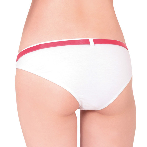 ●フルバックのホワイトショーツ●サイズ調整可能な赤い細ベルト●サイド部にベルトと交差する赤の縦ライン入り●左右と後ろにベルト通し付き●フルバック&ローライズタイプ。
