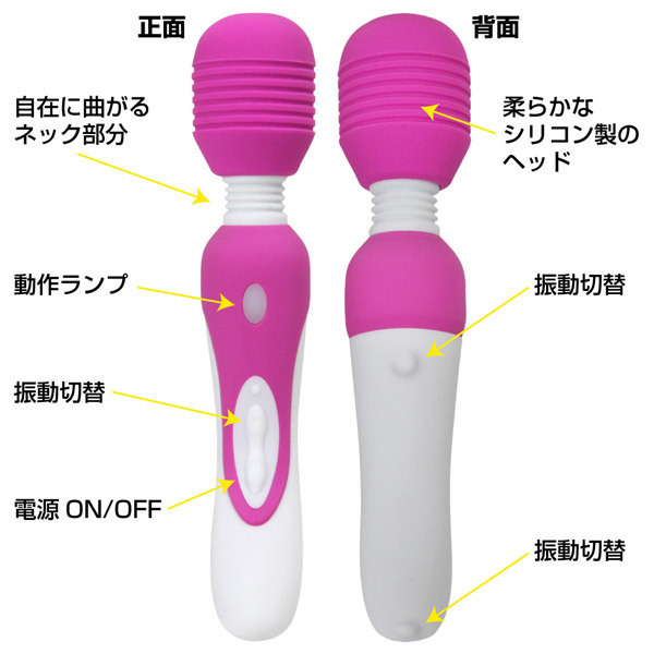 ●ポップで可愛い「シルフィー」電マ●J字にカーブしたユニークな持ち手●充電しながらでも使える交流タイプ●USB充電2h(フル)で2h連続使用可能●ノンストレスなフレキシブルネック●安心して使える生活防水・静音設計●強弱3段階&3種リズムの6パターン●パターン切替ボタンは正面・裏面上・底部の3か所に配置。