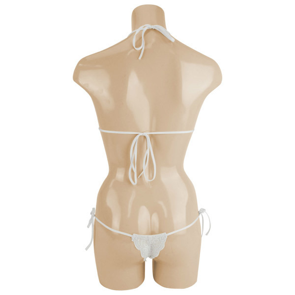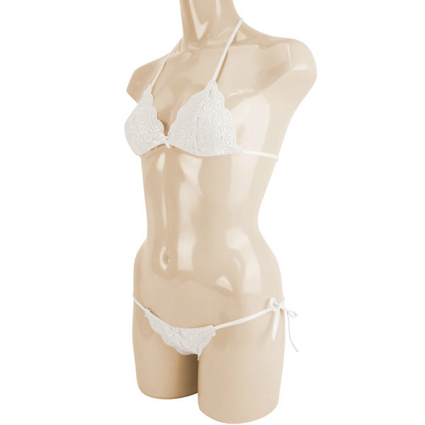 ●ホワイトカラーの総レース仕上げ●可愛いスカラップレースデザイン●着心地の良いストレッチ素材●ホルタータイプのブラレット●サイドで結ぶTバックショーツ●上下共に紐でサイズ調整可能。