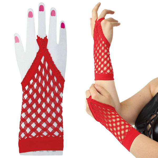 ●目を引く鮮やかなレッドカラー●指先がフリーなフィンガーレス●中指にリングを通して装着●手の甲を飾るデザインレース●手首をすっぽり隠す全長24cm●メッシュネットで通気性も◎●リブ加工でズレにくい仕様。