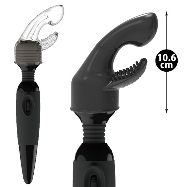●ヘッド径4.5〜5.2cmの電マに取付可能●肌に優しい柔軟エラストマー製●前のめり形状の二か所責めボディ●奥を絶妙に刺激するぷっくり先端●クリトリスに当たるブラシ型突起●ダークな雰囲気のブラック単色。
