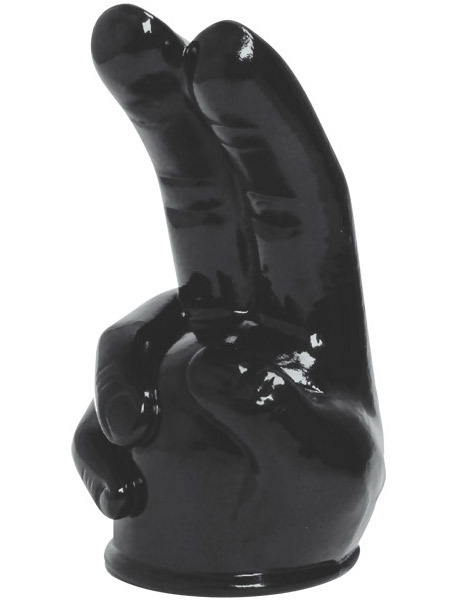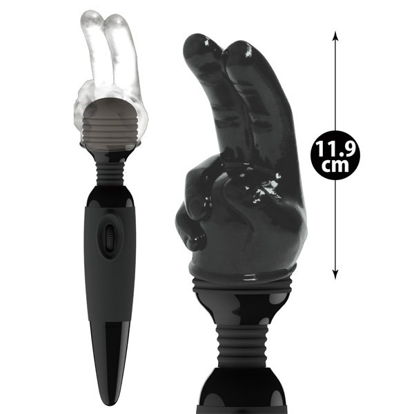 ●直径4.5〜5.2cmヘッドの電マに装着可能●大人の夜をアゲるブラックカラー●プニッと弾力のエラストマー素材●ピースサインのような二本指形状●角度をつけた指で手マン風プレイ●同型のクリアver(