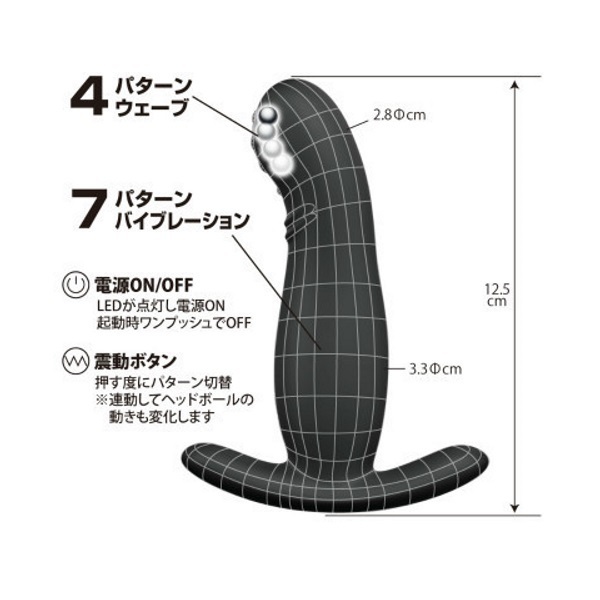 ●肌触りの良い高品質シリコン●全長12.5cm・最大径3.3φcm●スムーズ挿入のスリムボディ●開発しやすいストッパー付き●丸みのある先端にはイボ突起●内部のボールが小刻みに上下●先端は4段階にウェービング●芯まで響く強力モーター内蔵●盛り沢山な7種振動パターン●簡単メンテナンスの生活防水●電源はUSB充電式。