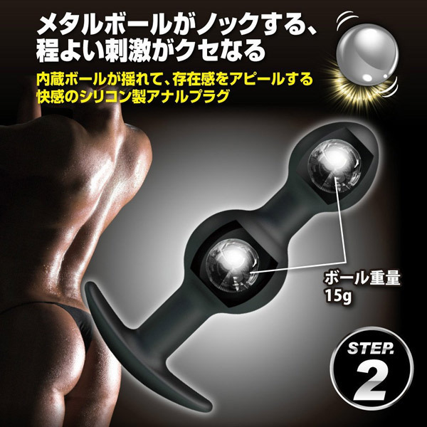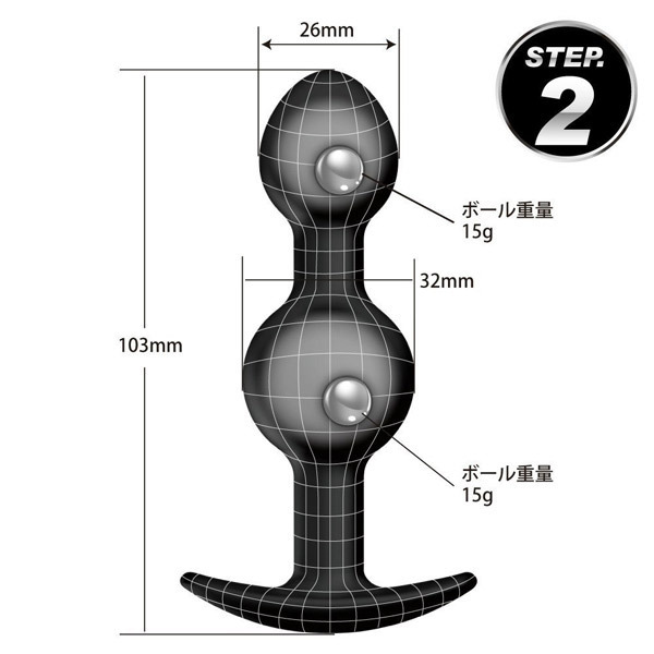 ●全長10.3cm×最大径3.2φcm●大小2連団子型の「STEP2」●ストッパー付きのプラグ形状●安心安全な高品質シリコン素材●重さ15gのメタルボールを2個内蔵●自在に動いて存在感をアピール。