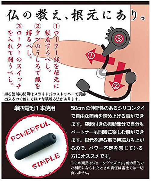ローター部を根元に装着し、玉袋の後ろで縄を縛ってローターのスイッチをON!締め付けによる持久力UPだけでなく、クリトリスに刺激を与えるローター搭載でパートナーと快感を共有可能!快感もパワー不足もアシストしてくれるマルチなアイテムです。