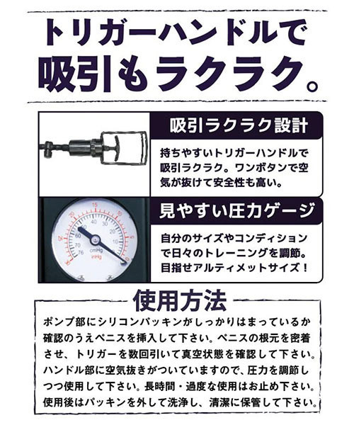 ●吸引レベルが解る圧力ゲージ付き●ラクラク吸引のトリガーハンドル●成長実感のメモリ付きシリンダー●密着感を高めるシリコンパッキン●ワンボタンで圧力解放の安全設計。