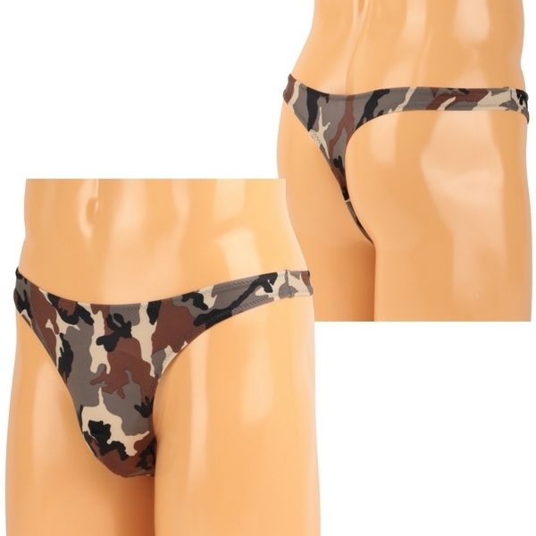 カジュアルな迷彩柄がボディを彩るメンズランジェリー!フロントはゆったり大きめに、バックはキュッと引き締めたTバックでセクシーな仕上がりです。