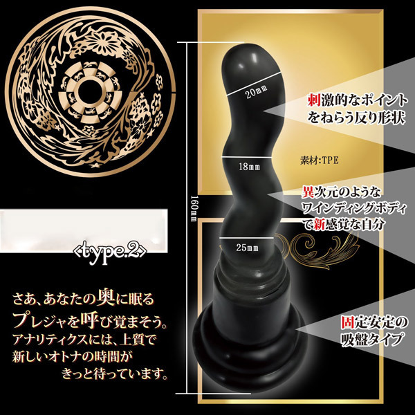 連続ウェーブで目覚める快感!ワインディングボディの吸盤付きアナルディルド「Analytics(アナリティクス) type2」。