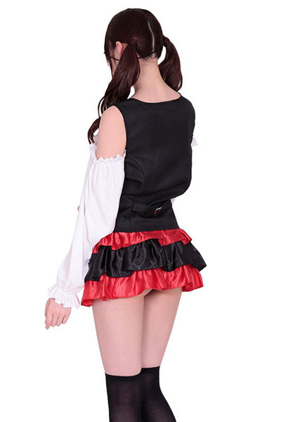 オフショルダーブラウス付きのベストと、黒×赤カラーの光沢ティアードフリルスカートのセット!眼帯&スカーフ帽の小物も付属した充実セットのパイレーツ衣装です。
