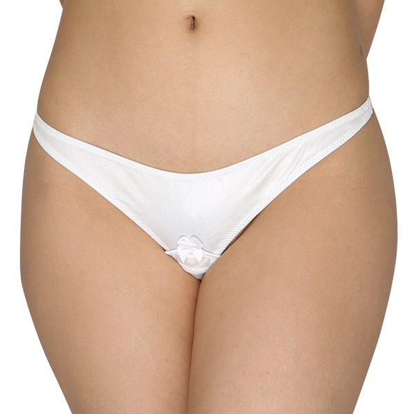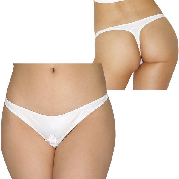 清楚なホワイトカラーのサラリとした光沢フェリカ生地を使用!フロントにちょこんとリボンを飾ったシンプルデザインながら、実はセクシーな秘密の仕掛けが…!クロッチ外側にはリモコンローター等を入れて楽しめる隠しポケット、クロッチ内側には8連のパール調ビーズを配置した大人仕様のランジェリー!女性用Mサイズ、安心の日本製です。