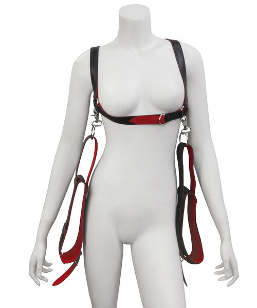 M字開脚を強制させて羞恥心を煽るSM用緊縛ベルト!背面のベルトで両腕を吊り下げられますが腕を完全に拘束するものではございませんので、手枷を別途ご用意頂くとより拘束感が高まります。