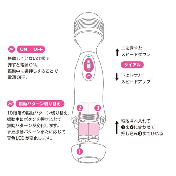 仕様:パッケージ:20.5×6.8×6.8cm 本体:全長19.5cm ヘッド部直径4.5cm 持ち手太さ4.2〜4.7cm 重量:179g 電池:単三電池×4本使用(電池は付属していません)