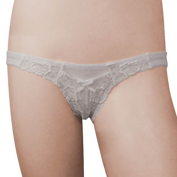 透け感のあるフローラルレースのフロントにお手持ちのローターを収納できるポケット付きランジェリー!後姿はセクシーなホワイトシースルーのフルバックタイプです。