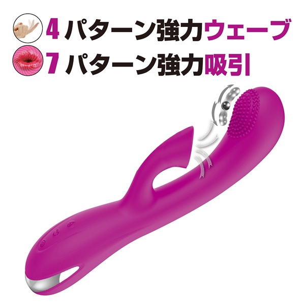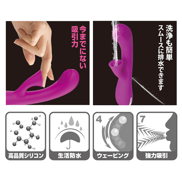 少し出っ張った先には細かなイボが設置され、内部には4パターンの上下ウェーブ動作を搭載したボールが内蔵!指で掻き出すような気持ちよさを感じられます♪また、人の口で吸われるかのようなソフトな吸い口で、クリを強力吸引して刺激しながらGスポとクリの同時責め!その気持ちよさは、いつもの刺激に飽きた方に大変オススメです♪本体は高品質なシリコンを採用で、多少の水濡れにも対応できる生活防水も搭載。