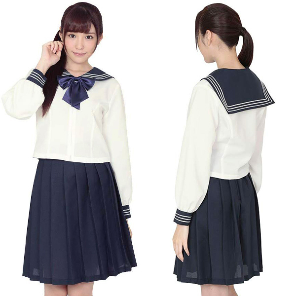 王道のセーラー服をアレンジ!前開きで襟や袖口の3本ラインが特徴的な長袖のセーラー服コスプレです。