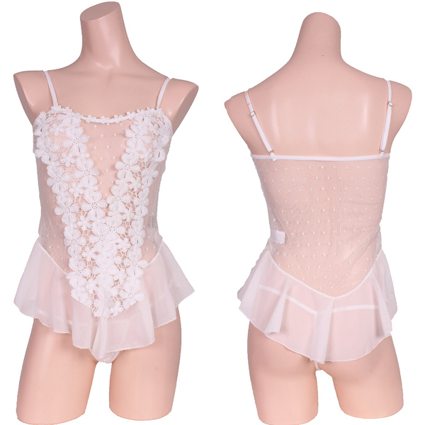 フロントに花柄モチーフをVラインにあしらい、裾のシフォンフリルでウエストのくびれを強調!ベースは模様入りストレッチネットだからフィット感抜群のベビードールとTバックの豪華セット。