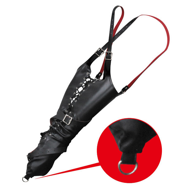 M奴隷を服従させたいなら、両腕を後ろにクロスさせ動きを封じてしまうコチラ、赤×黒カラーとフェイクレザーのアームバインダーがオススメ。