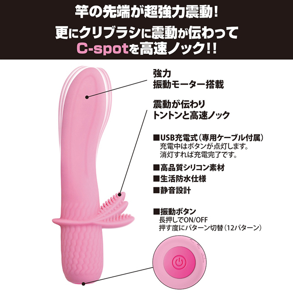 太さ最大3cmのぽっこりヘッドがGスポを直撃!内蔵されたモーターから伝わる強力振動で、細かな突起のついたブラシがクリトリスを高速で叩く♪ピンポイントで同時刺激することで「アッ」という間に絶頂快感へといざなうパステルピンクの可愛らしいUSB充電式バイブレーターです。