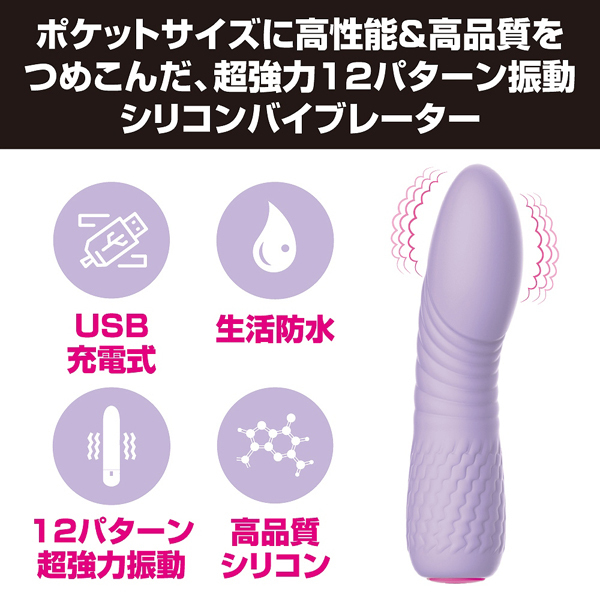 全長11.8cmのコンパクトなボディに高性能と高品質を詰め込みました♪12種の強力振動でピンポイント刺激が楽しめる淡いパープルカラーの一本式シリコンバイブレーター。