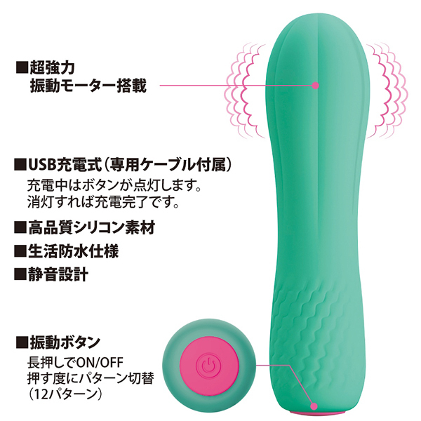 サボテンのような見た目が特徴的なコチラは全長11.6cm、太さ3.1cmの小型タイプながら、なんと12種もの振動パターンと一気に絶頂へと導く強力振動を搭載!出先でも気持ち良くなりたいなんて時には、鞄や車からサッと取り出して楽しめるのもこのコンパクトなシリコンバイブレーターの持ち味。