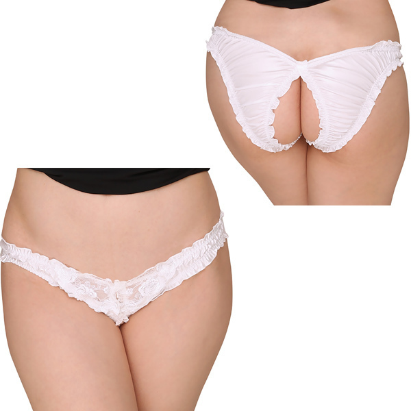光沢感のあるフェリカ生地とレースのコンビ生地で縫製された日本製ショーツ♪ローライズ仕様で既にセクシーさを感じさせていますが、なんとクロッチ部分とお尻部分を大胆にカットしており、どこから見てもエロさを感じさせるデザインとなっています。