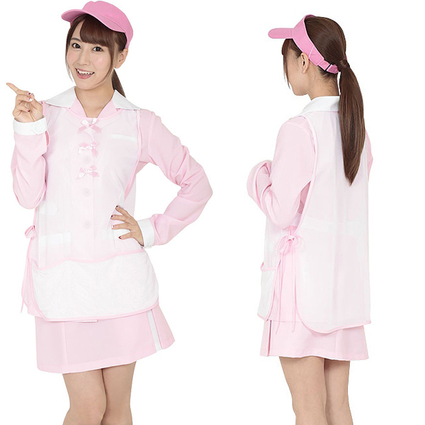 衣装を覆うビブス型ゼッケンのフロント部分にはピンクのリボンを三つあしらい可愛くデザイン!日差しをカットするサンバイザーもピンクで統一し、女性らしいフェミニンな雰囲気に♪程よい丈感のスカートはセクシーすぎず、キャディさんらしい健康的で可愛らしいコスプレ衣装となっています。
