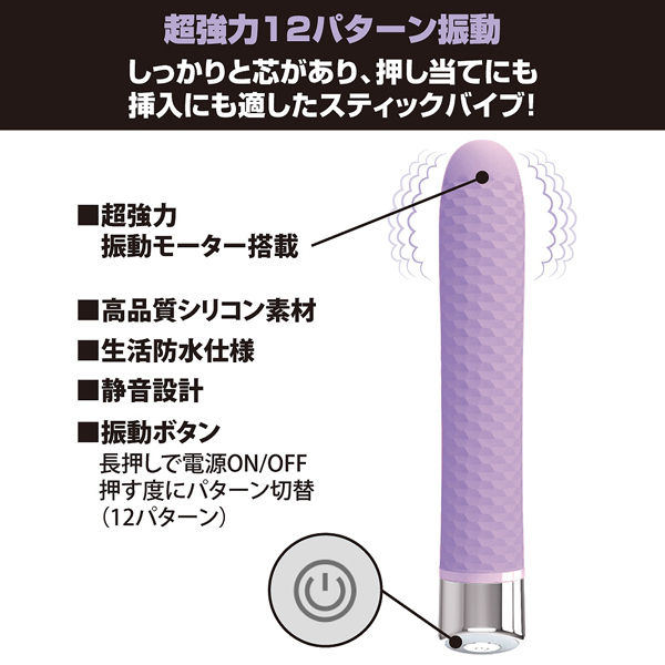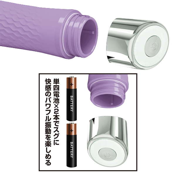 ボディには滑らか質感の高品質シリコンを使用!単四電池×2本で楽しめる本品は、先端部分に12パターンの振動を搭載した強力モーターを内蔵し、敏感部分への押し当てや根元まで挿入してポルチオ刺激したりと楽しみ方色々。
