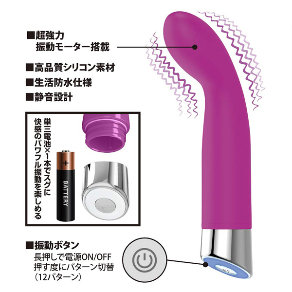 絶妙な先端の角度でGスポットを押し上げ、快感震動が直撃!滑らかで優しい質感のシリコンボディは押し当てにも適してます♪●12パターン強力震動●高品質シリコン●生活防水●電池別売