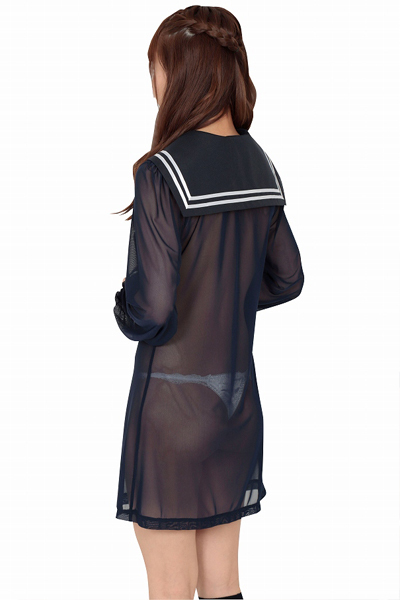 素肌ががっつり見えちゃうスケスケ仕様!シースルー生地で仕立てた紺のセーラーワンピース。