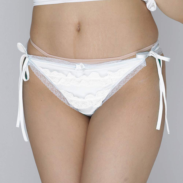 艶やかな光沢のある白生地に同色のフリルとレースを飾り甘く仕上げた日本製Tバック(白)。