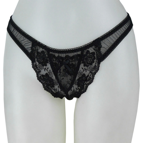 繊細な花柄レースでエレガントに飾る極薄生地の日本製Tバック(黒)。