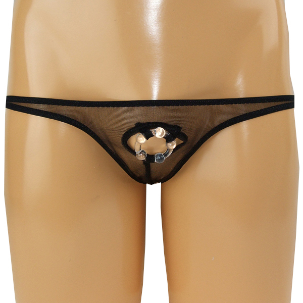 逞しいボディをアピールするならセクシーな小悪魔Tバックで決まり!極薄生地のフロント部分を丸く切り抜き、締め付け刺激するイボ付きリングを取り付けたメンズ用の日本製オープンランジェリー。