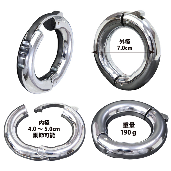 ワンタッチ装着で着脱楽々!内径は4〜5cmサイズで調節可能♪引っ張られる重厚感と締め付けがたまらないメタル仕様のペニスリングです。