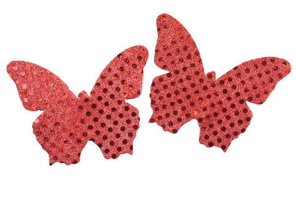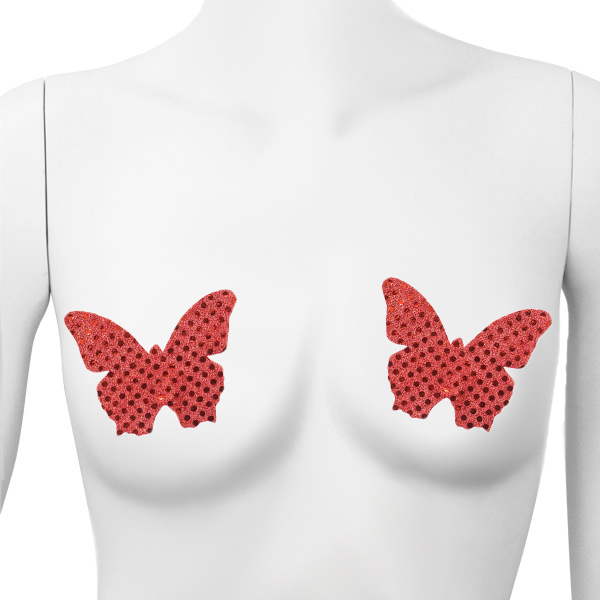 ラメがキラキラと光る赤い蝶で胸を飾るお洒落なニップレス(赤)。