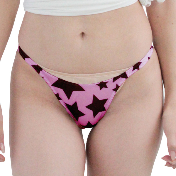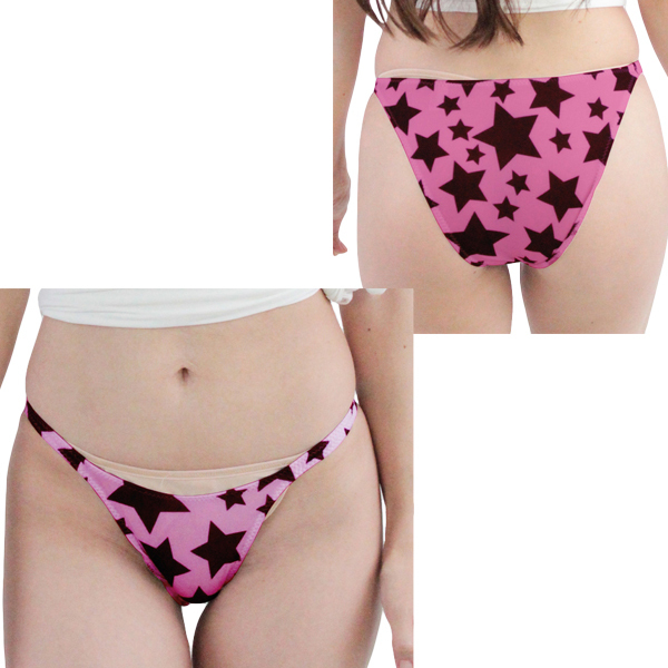 伸縮性のあるピンクのストレッチ生地に、大柄の星柄が目を惹くハイレグ仕様の日本製ハーフバック。
