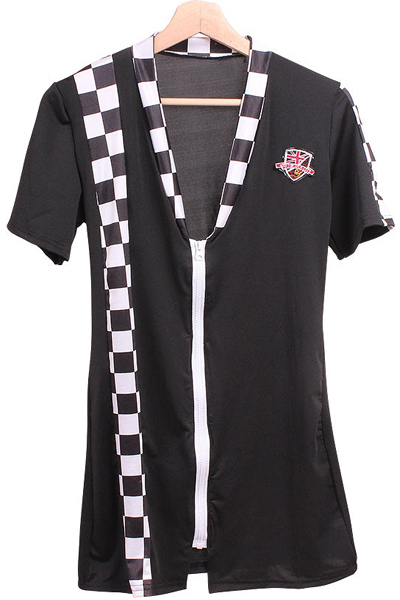 デコルテラインを美しくアピール!白黒のチェッカー柄が格好いいミニ丈ワンピのレースクイーン衣装。
