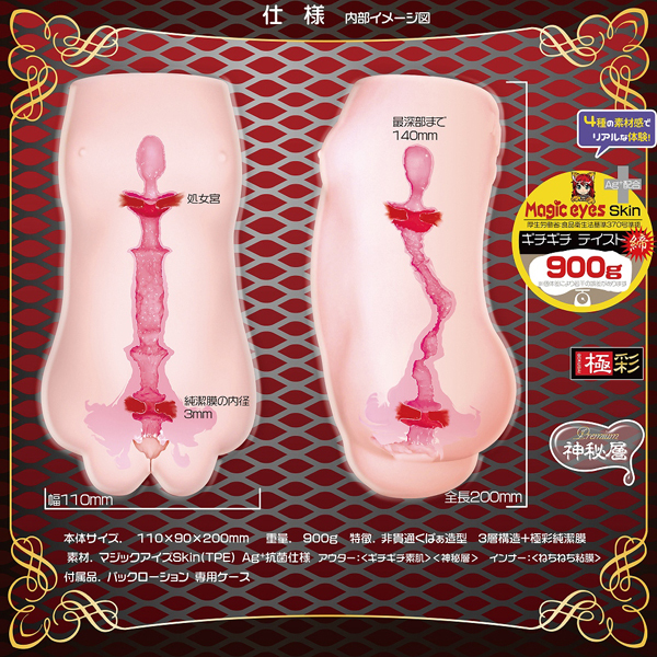 素材にはAg+抗菌仕様のマジックアイズスキンを使用!4種の素材で締め付けと粘膜感が味わえる非貫通オナホ。