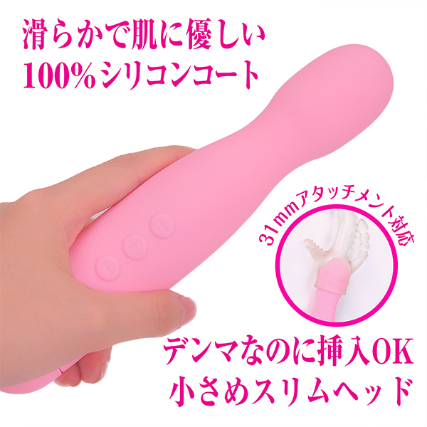ヘッド幅3.4cmと細く挿入が可能で、IPX8等級仕様なので入浴しながら使いたい方にうってつけ!強弱は12段階、リズム振動は10パターン搭載♪多彩なアクションながらも3つのボタンで簡単操作!31mmアタッチメントに対応した中イキ派&外イキ派も満足できる逸品。