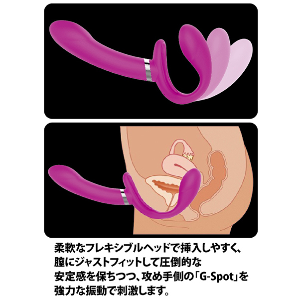 女性器の膣内にオルガ型のシャフトを挿入して固定!そしてペニス型の挿入シャフトでパートナーをガンガン突きながらお互いが気持ちよくなれます♪ペニバン要らずなモーター内蔵のオルガ形状だから抜けにくく、クリ周辺を挟み込むようなスタイルになりながらふたなりっぽいプレイ!パートナー側の挿入シャフトには先端部分にモーターを内蔵。