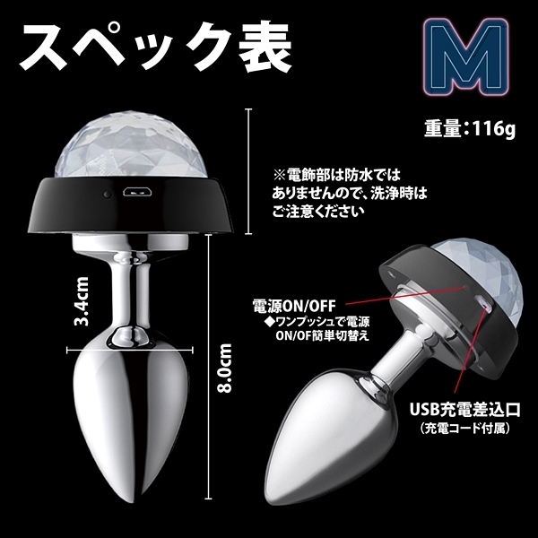 ステンレス製のアナルプラグでテール部分の電飾LEDライトが音楽に合わせて反応し光がアクション♪アナルで超パリピになる新感覚のプラグです!電源はUSB充電式で3種類の鮮やかな光(LED)が部屋を彩り気分も向上♪3サイズ展開でこちらは標準的なMサイズ!光るアナルプラグでパリピに楽しもう♪電源はUSB充電式ですが電飾部分は防水じゃないのでメンテ時にはご注意ください。