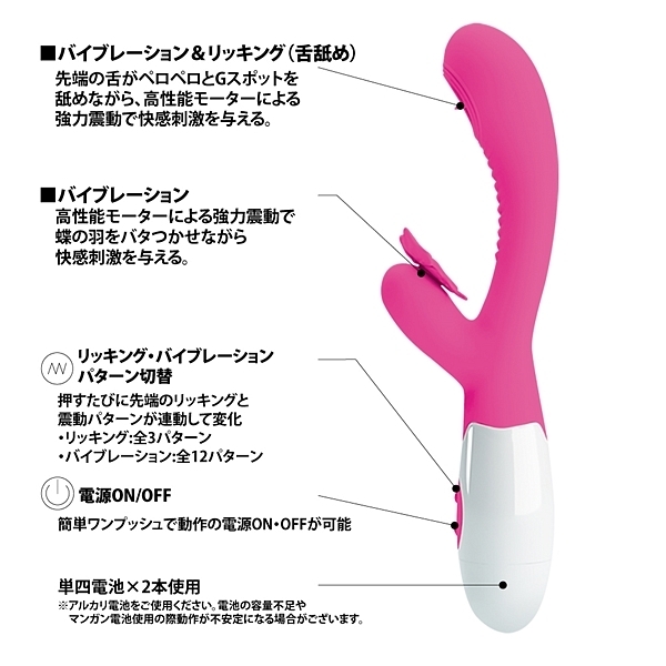 Gスポットを舌先でペロペロと高速愛撫するような快感と、子機に装着されたバタフライの強力震動による快感に絶頂必至間違いなし。