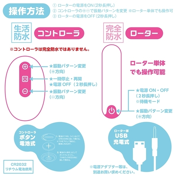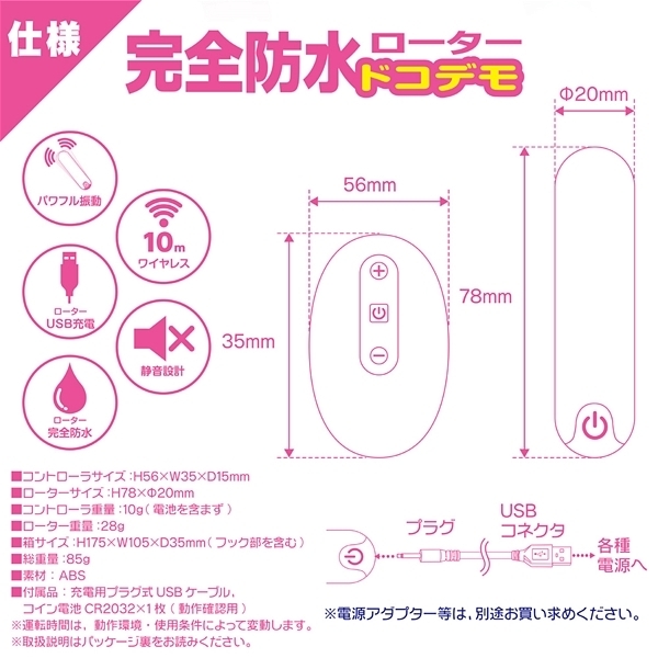 仕様:パッケージ:17.5×10.5×3.5cm 本体:ローター7.8×2.0cm・コントローラー5.6×3.5×1.5cm 電池:本体(USB充電式)、リモコン(ボタン電池CR2032)