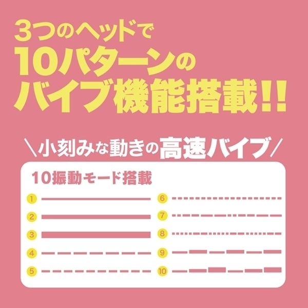 振動パターンも10種搭載、本体重量57gと超軽量で生活防水タイプの為、丸洗い可能。