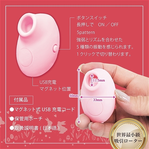 アンケートで女性に好評だったパステルカラー3色が揃ってデビュー!「エアーバルブ方式」を採用し、近年発売されるトイの中でも注目度の高い吸引系グッズを、世界最小レベルの超小型化に成功。